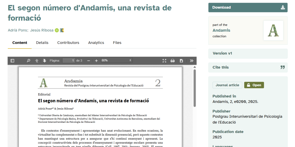 Ens plau comunicar-vos que s’ha publicat el segon número d’Andamis: Revista del Postgrau Interuniversitari de Psicologia de l’Educació. S’hi pot accedir des del grup de la revista a la Comunitat MIPE-DIPE https://comunidad.psyed.edu.es/blog/view/22847/andamis-2-2025 o fent clic aquí.